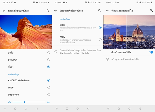 หน้าจอสามารถปรับโทนสีภาพได้อย่างละเอียด และปรับแต่งค่า Refresh Rate เพื่อประหยัดแบตเตอรี่ แต่อย่างที่บอกครับว่า OnePlus 7 Pro แบตเตอรี่อึดมากๆ สามารถปรับเป็น 90Hz Refresh Rate ใว้ตลอดเวลาได้เลย นอกจากนี้ยังสามารถปรับโทนสีภาพในขณะรับชมคลิปวีดีโอให้ดูสดใสมากขึ้นได้ด้วย