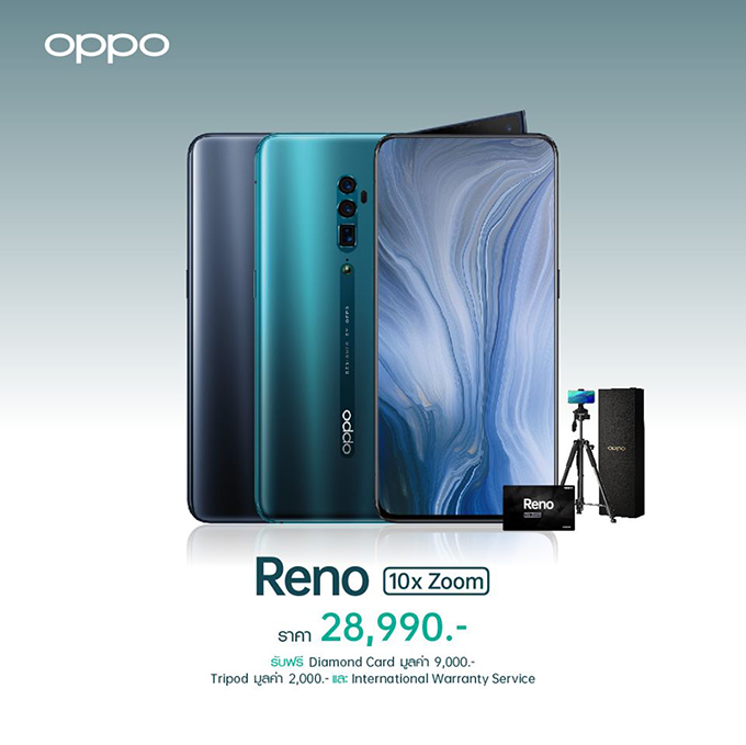 สำหรับลูกค้าที่สั่งจอง OPPO Reno 10x Zoom ในช่วง Pre-Order ตั้งแต่ 4-14 มิถุนายนนี้ รับชองแถมสุดพรีเมี่ยม ได้แก่ Diamond Card มูลค่า 9,000 บาท ด้วย International warranty service พร้อมทั้ง Replacement Service บริการเปลี่ยนเครื่อง เมื่อเครื่องมีปัญหา และ ขาตั้งกล้อง มูลค่า 2,000 บาท และหากสั่งจอง OPPO Reno ลูกค้าจะได้รับ Premier Card มูลค่า 5,000 บาท สำหรับลูกค้า AIS และ True ที่สั่งจอง OPPO Reno 10x Zoom ในช่วง Pre-Order ตั้งแต่ 4-13 มิถุนายนนี้ ราคาเริ่มต้นที่ 8,990 บาท และดีแทคราคาเริ่มต้นที่ 14,990 บาท (ตามเงื่อนไขที่กำหนด)