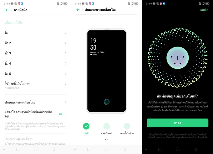 OPPO Reno 10x Zoom หน้าจอรองรับ Fingerprint (under display) ซึ่งมาพร้อมเทคโนโลยี Hidden Fingerprint Unlock 2.0 เป็นการสแกนลายนิ้วมือใต้หน้าจอ ซึ่งมีความแม่นยำและรวดเร็วมากขึ้นกว่าเดิมถึง 20% - 30% เลยทีเดียว แถมมีการนำ AI มาช่วยในการวิเคราะห์ด้วยนะครับ จากการทดสอบให้ผลลัพธ์ที่ดีมากๆ รวดเร็วและแม่นยำ ผมไม่เคยสแกนพลาดเลย จุดนี้น่าประทับใจมากครับ รวมทั้งสวยงามด้วยเอฟเฟ็กต์ที่หลากหลาย และในรุ่นนี้ยังคงมี Face Unlock สแกนใบหน้ามาให้เหมือนเคย