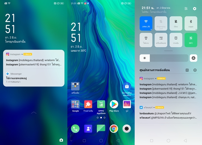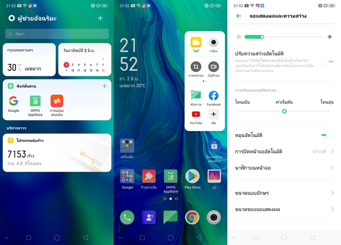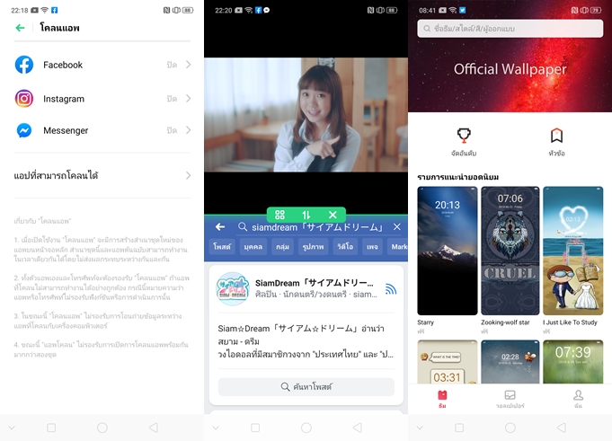 ฟีเจอร์โคลนแอปฯ สำหรับการใช้งานแอปฯ Social พร้อมกัน 2 แอคเคาท์ และรองรับการใช้งาน 2 หน้าจอพร้อมกัน App Split-Screen วิธีเปิดใช้งานทำได้หลายวิธีเลยครับ เช่น ใช้นิ้วมือ 3 นิ้วลากหน้าจอขึ้นไปด้านบน, แตะค้างที่ปุ่ม Multitasking, เข้าไปในหน้า Multitasking แล้วเลือกแอปฯ ที่เราต้องการใช้งานแบบแบ่งหน้าจอ และแน่นอนครับว่า OPPO มี Theme Store และ App Store ของตัวเองด้วย สามารถเข้าไปใช้บริการกันได้นะครับ