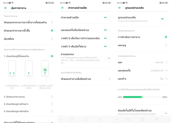 ปุ่มนำทางด้านล่างสามารถซ่อนได้ และเลือกใช้ Gesture ในการควบคุมการทำงานแทนได้อย่างสมบูรณ์แบบ รวมทั้งลูกเล่น Gesture ต่างๆ นั้นก็ยังคงใส่เข้ามาให้อย่างเต็มที่เหมือนเคย ทั้งแตะหน้าจอเพื่อเปิดใช้งาน วาดตัวอักษรที่หน้าจอในขณะที่หน้าจอปิดอยู่ เพื่อเปิดใช้งานแอปพลิเคชั่นต่างๆ หรือใช้ 3 นิ้วลากจับภาพหน้าจอเป็นต้น รวมทั้งฟีเจอร์ Assistive Ball เป็นคำสั่งลัดในการเข้าถึงการทำงานในส่วนต่างๆ