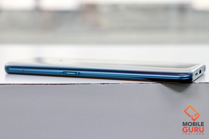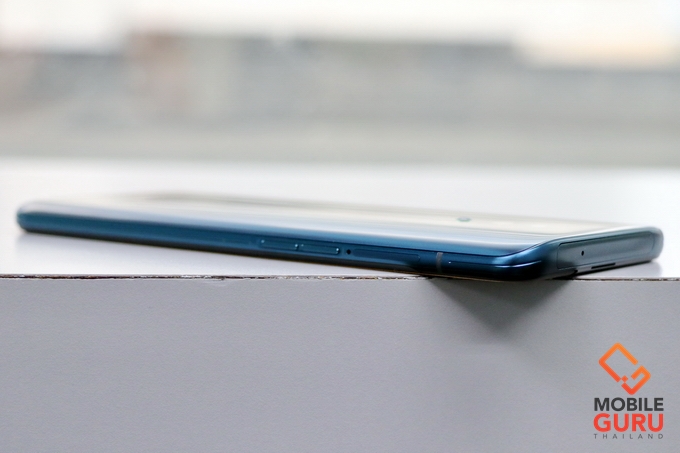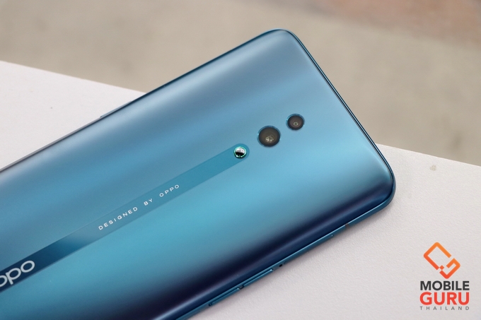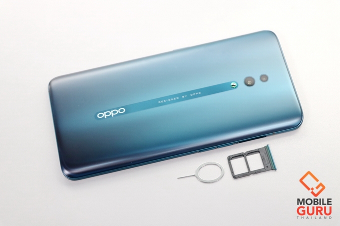 OPPO Reno มาพร้อมฝาหลังดีไซน์ไล่เฉดสีสวยงาม สำหรับสี Ocean Green ที่นำมารีวิว จะเป็นผิวด้านผสมในส่วนที่เป็นผิวเงาดูสวยงาม มีการเคลือบอย่างดี ทำให้ไม่เป็นรอยนิ้วมือง่ายๆ รวมทั้งเป็นรอยขีดข่วนได้ยาก บริเวณกล้องคู่จะเรียบเนียนไปกับฝาหลังไม่มีส่วนที่นูนขึ้นมาเลยครับ นอกจาก O-Dot เป็นปุ่มขนาดเล็ก ช่วยในการยกฝาหลังให้ไม่สัมผัสกับพื้นโดยตรงเมื่อวางเครื่องบนโต๊ะ ดีไซน์ดูสวยงามมากจริงๆ ครับ