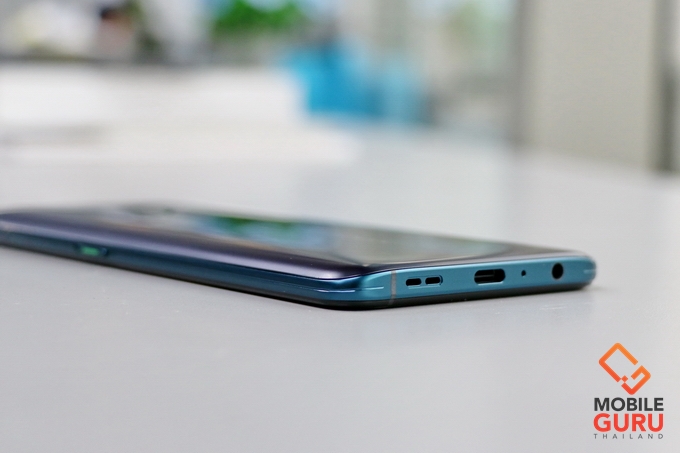 OPPO Reno ด้านบนมีกล้องหน้าเลื่อนขึ้น-ลงแบบใหม่ Pivot-Rising และไมค์ตัดเสียงรบกวน ส่วนด้านล่างมีพอร์ทหูฟัง 3.5 มม. ไมโครโฟน พอร์ท USB Type-C และลำโพง (รุ่นนี้มีลำโพงคู่นะครับ รองรับระบบเสียง Dolby Atmos) ด้านซ้ายมีปุ่มปรับระดับเสียงและถาดใส่ซิม ด้านขวามีปุ่ม Power