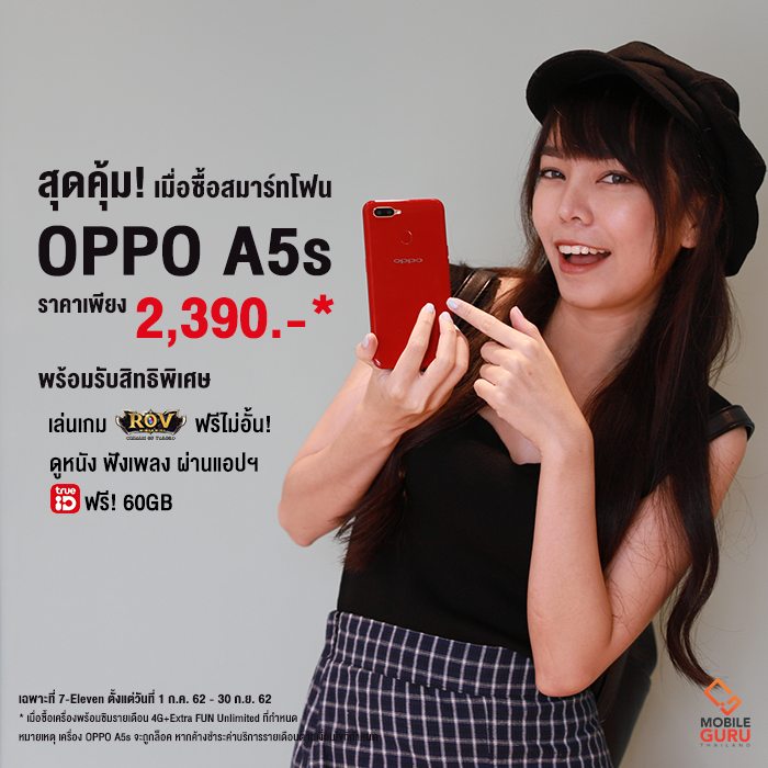 สามารถเป็นเจ้าของสมาร์ทโฟน OPPO A5s รุ่นรองรับเครือข่ายทรูมูฟเอช ในราคาพิเศษ เพียง 2,390 บาทเท่านั้น จากปกติ 4,999 บาท เฉพาะที่ 7-Eleven (และเฉพาะสีแดงเท่านั้น) เมื่อซื้อเครื่องพร้อมซิมรายเดือน แพ็กเกจ 4G+ Extra FUN Unlimited 499 ระยะสัญญา 12 เดือน สิทธิพิเศษ