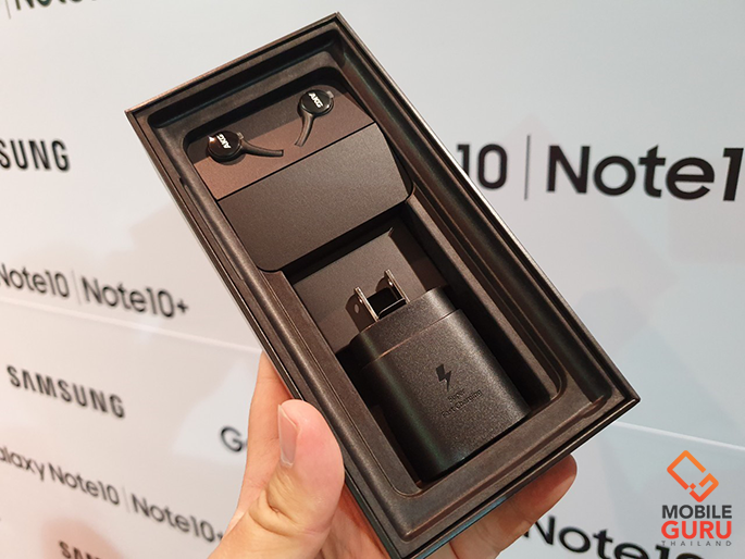 ตัวเครื่อง Samsung Galaxy Note 10+ เคสใส อแดปเตอร์ชาร์จไฟ (Super Fast Charging) สายชาร์จ USB-C ชุดหูฟัง AKG หัวเชื่อมต่อแบบ USB-C เข็มจิ้มซิม หัวปากกา S Pen สำรอง คีมคีบหัวปากกา คู่มือการใช้งาน จุดเด่น