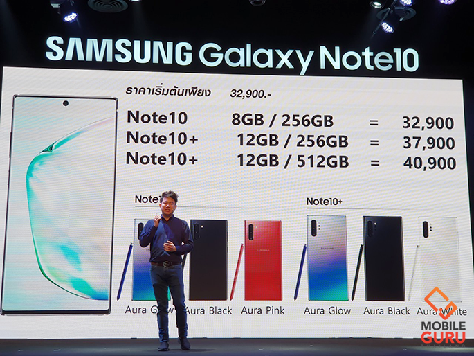 Samsung Galaxy Note 10 จะวางจำหน่ายในรุ่นความจุ RAM 8 GB + ROM 256 GB ราคาgเปิดตัวที่ 32,900 บาท มีให้เลือก 3 สี ได้แก่ Aura Glow, Aura Black และ Aura Pink