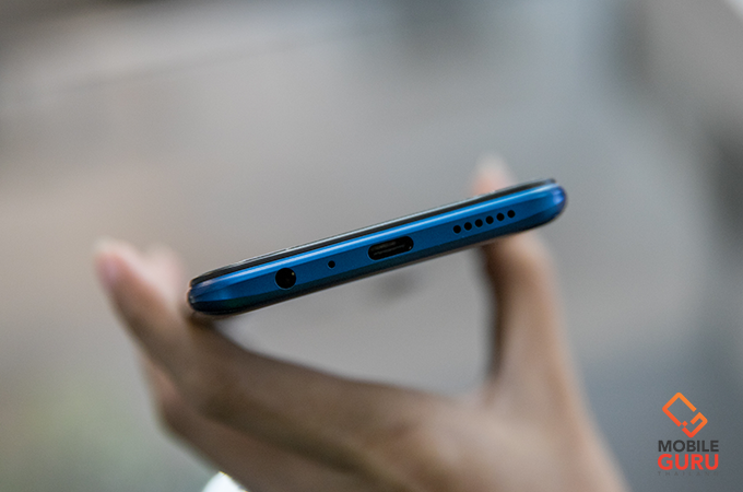 ด้านล่างของตัวเครื่อง มีลำโพงเสียงตัวเครื่อง (Mono), พอร์ตเชื่อมต่อ USB-C, ไมค์สนทนา และรูเสียบชุดหูฟัง 3.5 มิลลิเมตร
