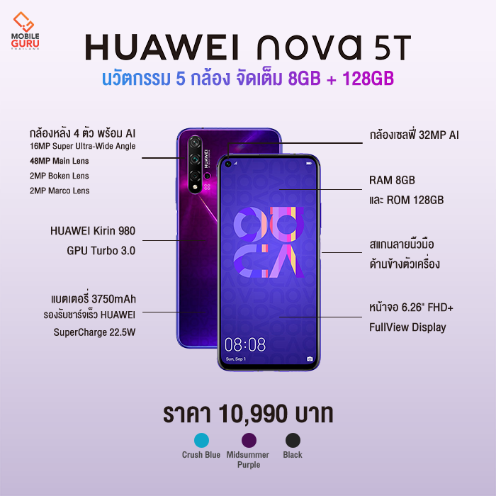 หัวเว่ย ประเทศไทย วางจำหน่าย Huawei Nova 5T ในราคา 10,990 บาท พร้อมสีตัวเครื่องทั้งหมด 3 สี คือ สีไฮไลท์ของรุ่นอย่างสีม่วง Midsummer Purple จะเป็นสีเดียวที่มีโลโก้ Nova สกรีนบนฝาหลัง, สีดำ Black และสีน้ำเงิน Crush Blue โดยจะเริ่มวางจำหน่ายทางการในวันที่ 21 กันยายน 2562 เป็นต้นไป และตอนนี้ทางหัวเว่ยก็ได้เปิดรับจองตัวเครื่องล่วงหน้าแบบพรีออเดอร์ตั้งแต่วันที 4 - 15 กันยายน 2562