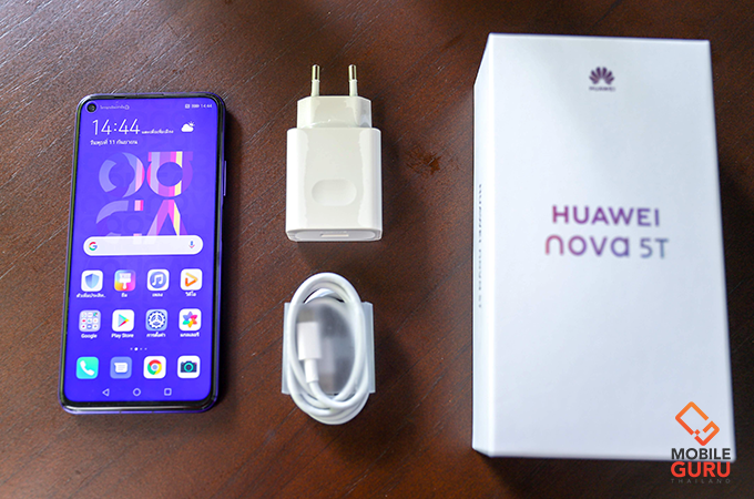 Huawei Nova 5T มาพร้อมตัวกล่องสีขาว ด้านหน้าของกล่องมีชื่อรุ่นแปะไว้ให้เห็นอย่างชัดเจน และภายในมีอุปกรณ์ภายในกล่องให้เริ่มต้นมาตามนี้เลยครับ