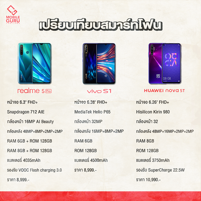 สำหรับในเรื่องของราคาวางจำหน่ายนั้น ถือเป็นอีกหนึ่งเหตุผลสำคัญในการตัดสินใจเลือกซื้อ โดยทั้ง 3 รุ่นที่เรานำมาเปรียบเทียบกันในวันนี้ ทั้ง realme 5 Pro, Huawei Nova 5T และ Vivo S1 ต่างก็เป็นสมาร์ทโฟนที่อยู่ใน Rank ราคาที่ใกล้เคียงกัน ซึ่งหลังจากพิจารณาในเรื่องของประสิทธิภาพให้ตรงกับความต้องการในการใช้งานแล้ว ก็อย่าลืมมาดูความคุ้มค่าของราคากันด้วยนะ