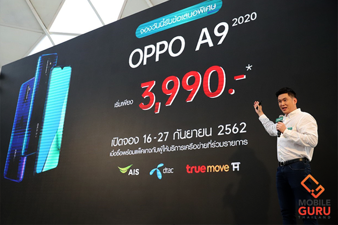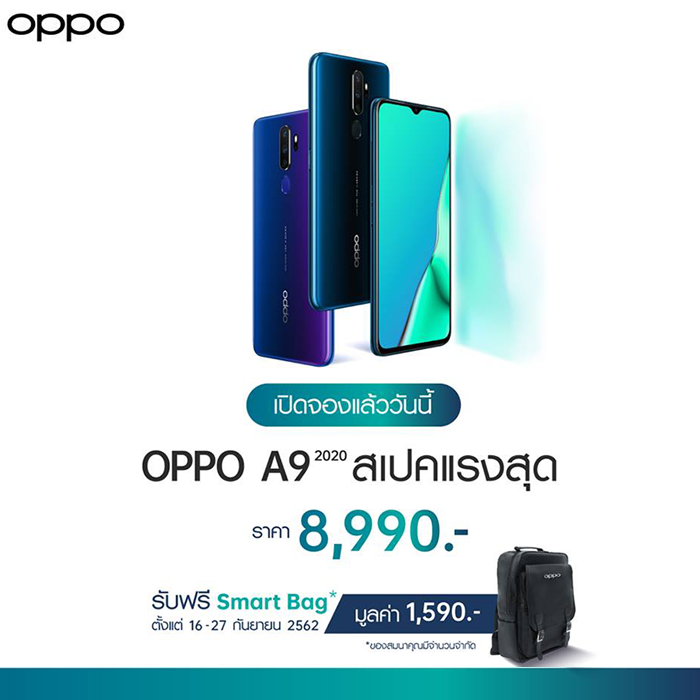 ย้ำกันอีกครั้ง สำหรับใครที่สนใจ OPPO A9 2020 จะมีให้เลือก 2 สี ได้แก่ Marine Green และ Space Purple โดยวางจำหน่ายในราคา 8,990 บาท สามารถจองได้ตั้งแต่วันที่ 16 - 27 กันยายนนี้ ที่ OPPO Brand shop และตัวแทนจำหน่ายทั่วประเทศ พร้อมรับฟรี! OPPO Smart Bag สุดเท่ มูลค่า 1,590 บาท (ของสมนาคุณมีจำนวนจำกัด) พิเศษสุด! เป็นเจ้าของได้ในราคาเริ่มต้นเพียง 3,990 บาท เมื่อซื้อเครื่องพร้อมแพ็คเกจกับ AIS, dtac และ Truemove H ห้ามพลาดเด็ดขาดนะครับ