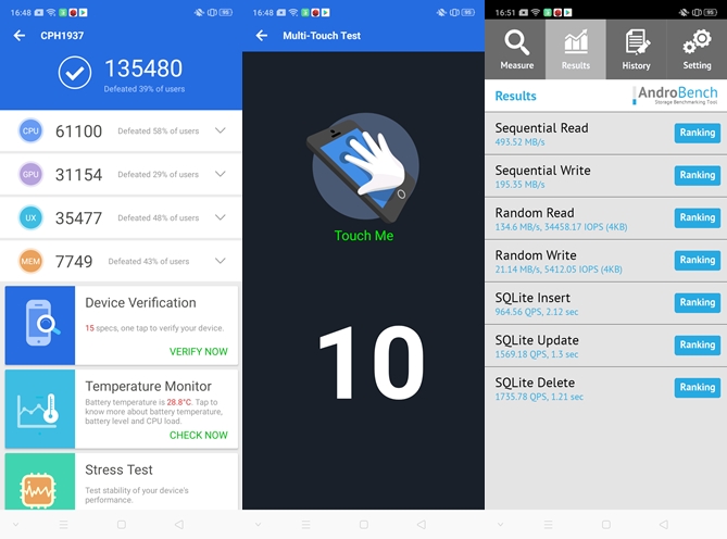 - ทดสอบด้วยแอปพลิเคชั่น AndroBench ทำความเร็วในการอ่านอยู่ที่ 493.52 MB/s (UFS 2.0 Storage)