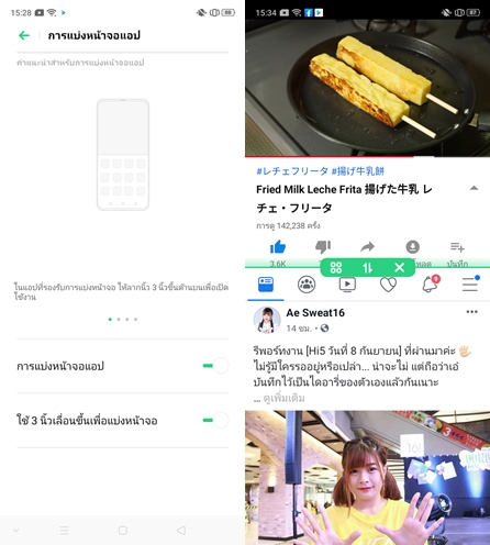 App Split-Screen เป็นการแบ่งหน้าจอเป็น 2 ส่วนสามารถทำงานได้หลายอย่างในเวลาเดียวกัน โดยจะใช้ Smart Gesture 3 นิ้วในการลากหน้าจอขึ้นเพื่อแบ่งหน้าจอ หรือไปที่ Recent App แล้วเลือกเครื่องหมายขีด 3 ขีดด้านขวา แล้วเลือกคำสั่งแบ่งหน้าจอได้เลยครับ (มีเพื่อนๆ ถามกันเข้ามาเยอะมากเลยครับ จะเห็นว่ามันง่ายนิดเดียว)