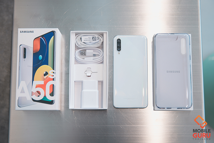 ตัวเครื่อง Samsung Galaxy A50s สายชาร์จ USB-C อแดปเตอร์ชาร์จไฟ เข็มจิ้มซิม ชุดหูฟัง คู่มือการใช้งานและใบรับประกันสินค้า เคสใส รายละเอียดสเปกของ Samsung Galaxy A50s