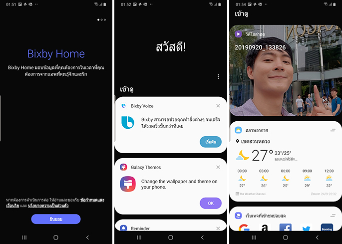 เมื่อปัดหน้าจอไปทางด้านซ้าย จะเข้าสู่หน้าของ Bixby Home ที่เป็นหน้ารวมข้อมูล แอปพลิเคชั่น และการแจ้งเตือนต่าง ๆ ที่จะมีการปรับแต่งเนื้อหาให้เหมาะสมกับผู่ใช้งานแต่ละคนอีกด้วย
