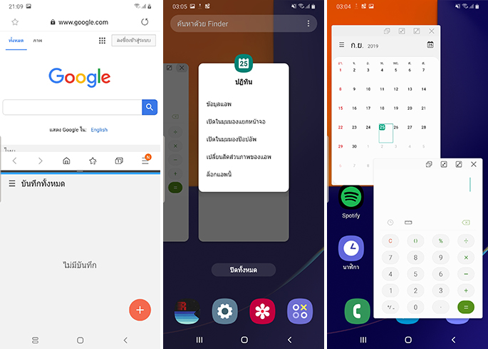 การแบ่งหน้าจอ เพื่อใช้งาน 2 แอปพลิเคชั่นบนหน้าจอเดียว ยังคงเป็นฟีเจอร์เด่นที่คนส่วนใหญ่ต้องการใช้งาน สามารถเรียกใช้งานได้ด้วยกดปุ่มมัลติทาส์กค้างไว้ จากนั้นแตะที่ไอคอนแอป แล้วเลือก 'เปิดในมุมมองแยกหน้าจอ' นอกจากนี้ยังสามารถเปิดเป็นหน้าจอเต็มแบบ pop-up เลยก็ได้ โดยเปลี่ยนไปเลือกเป็น 'เปิดในมุมมองป๊อปอัพ' แทน
