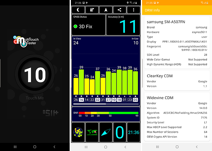 ทดสอบด้วยแอปฯ AnTuTu Benchmark ได้คะแนน 151,455 คะแนน ทดสอบด้วยแอปฯ GeekBench 5 ได้คะแนน Single Core 261 คะแนน และ Multi Core 1,154 คะแนน ทดสอบด้วยแอปฯ MultiTouch Tester รองรับการสัมผัสสูงสุด 10 จุด การจับสัญญาณทดสอบด้วย GPS Tester จับสัญญาณได้อย่างรวดเร็ว ทดสอบ DRM Info รองรับ Widevine DRM L1 สามารถดู Netflix ที่ความละเอียด HD การใช้งานสื่อบันเทิงต่างๆ