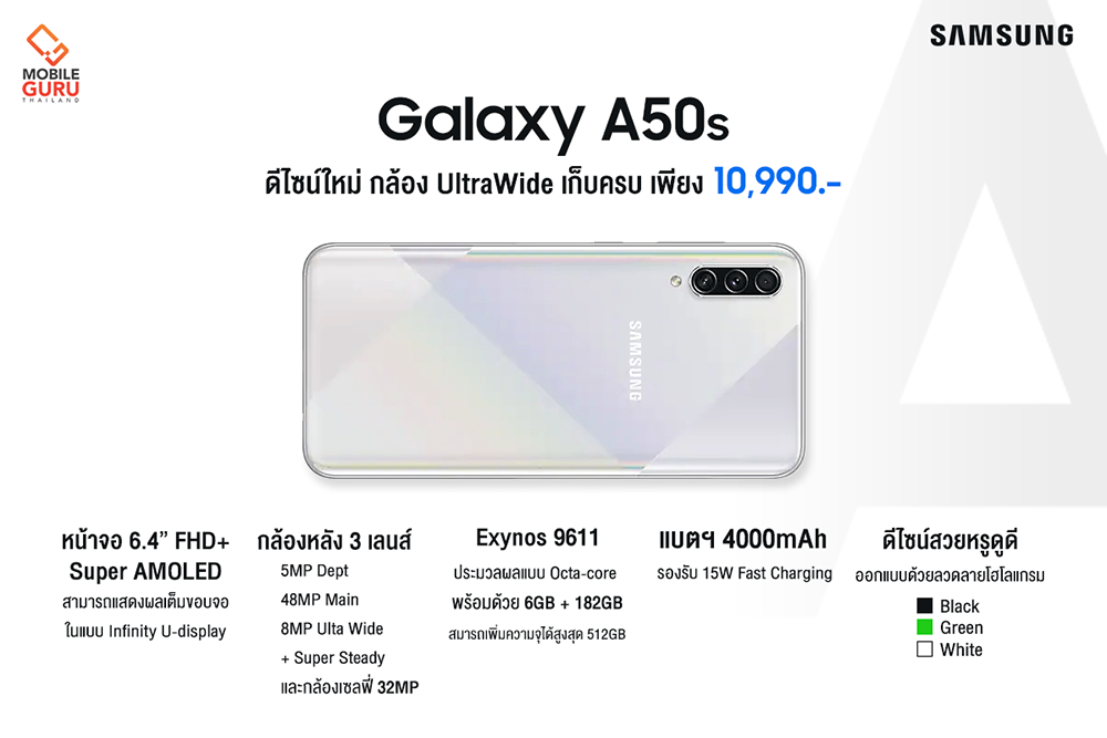 Samsung Galaxy A50s มีให้เลือกทั้งหมด 3 สี คือ สีดำ Prism Crush Black, สีขาว Prism Crush White และสีเขียว Prism Crush Green และมีเพียง 1 รุ่นความจุ คือ รุ่น RAM 6GB + ROM 128GB วางจำหน่ายแล้ววันนี้ ในราคา 10,990 บาท