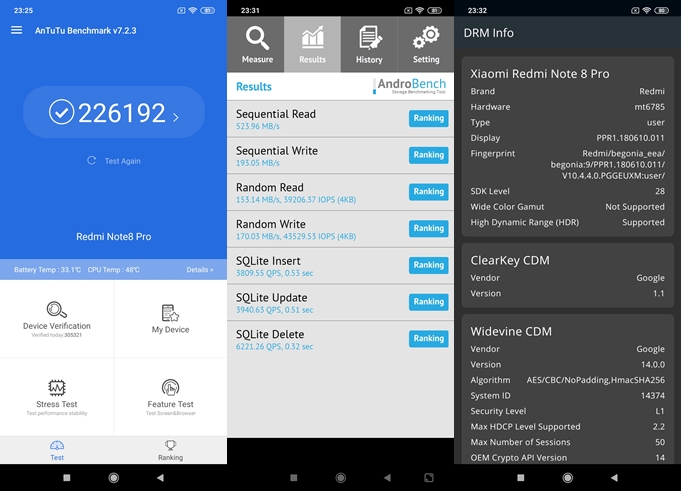 - ทดสอบด้วยแอปพลิเคชั่น AndroBench ทำความเร็วในการอ่านอยู่ที่ 523.96 MB/s