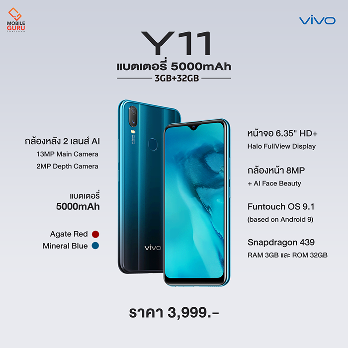 โดยรุ่นนี้มาพร้อมดีไซน์ที่สวยงาม หน้าจอ Halo FullView Display ขนาด 6.35 นิ้ว ความละเอียด HD+, ชิปเซ็ต Qualcomm Snapdragon 439, RAM 3GB, ROM 32GB รองรับ MicroSD 256GB, กล้องคู่ 13MP + 2MP และกล้องหน้า 8MP, แบตเตอรี่ความจุสูง 5,000 mAh รองรับชาร์จเร็ว 10W ทั้งหมดนี้เปิดราคามาที่ 3,999 บาท เท่านั้น มีให้เลือก 2 สี ได้แก่ สีฟ้า Mineral Blue และสีแดง Agate Red เป็นยังไงครับ น่าสนใจแล้วใช่ไหม? เรามาอ่านรีวิว Vivo Y11 อย่างละเอียดกันได้เลยครับ