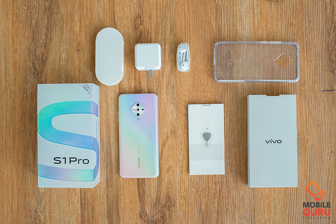 Vivo S1 Pro บรรจุมาในแพ็กเกจกล่องทรงสี่เหลี่ยม เล่นโทนสีเทาและมีลายริ้วสีเงินเป็นตัวอักษร "S" ตัวใหญ่บนฝากล่อง พร้อมโลโก้แบรนด์และชื่อรุ่น