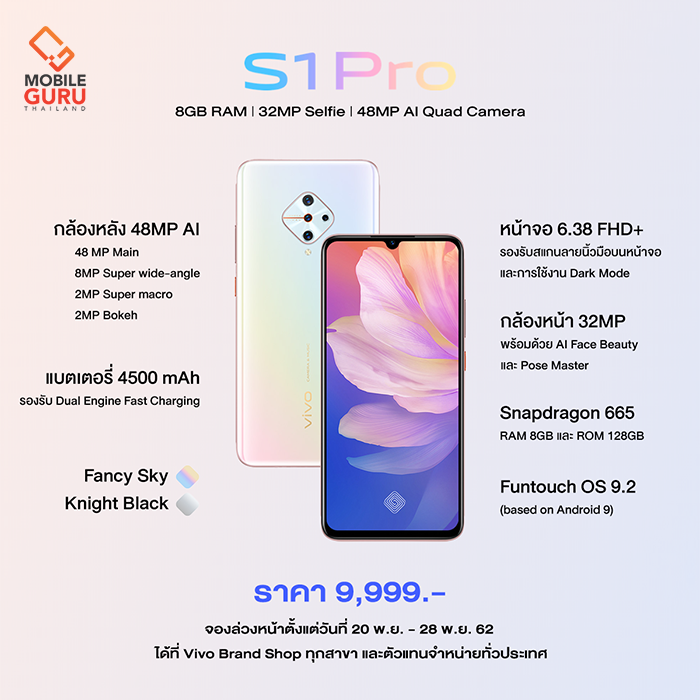 Vivo S1 Pro มาพร้อมความจำ RAM ขนาด 8 GB + ROM ขนาด 128 GB มีให้เลือก 2 สี คือ สีดำ Knight Black และสีขาว Fancy Sky ในราคาวางจำหน่ายเพียง 9,999 บาทเท่านั้น!