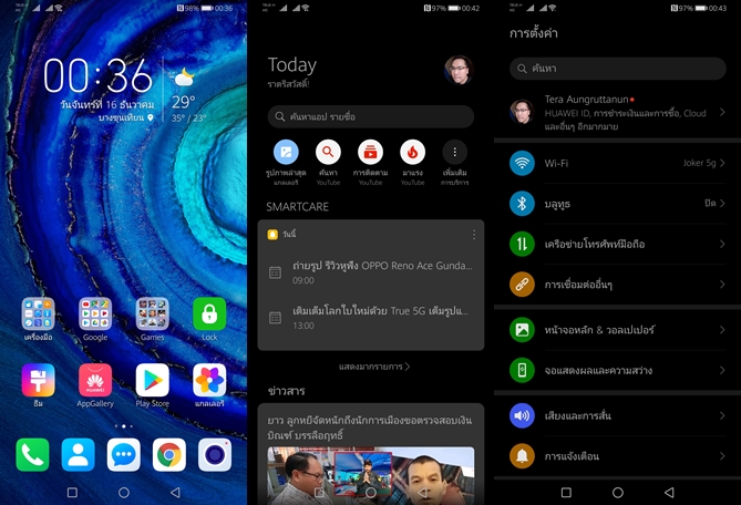 สำหรับเครื่องนี้ผมได้ติดตั้ง Google Mobile Service (GMS) เป็นที่เรียบร้อย (แต่จริงๆ ก็ไม่แนะนำนะครับ เพราะมันไม่ถูกต้อง รวมทั้งจะต้องแบกรับความเสี่ยงกันเอง) ทำให้สามารถใช้บริการ และใช้งานต่างๆ ได้ตามปกติ ไม่อย่างนั้นการใช้บริการ Google Mobile Service (GMS) จะต้องทำผ่านเบราเซอร์เท่านั้น รวมทั้งการใช้งานแอปพลิเคชั่นต่างๆ ส่วนมากก็จะไม่สมบูรณ์ เพราะจะมีการเรียกหา GMS แม้ว่าจะติดตั้ง GMS เองแล้วก็ตาม หลายแอปฯ ก็รู้อยู่ดีนะครับ อย่างเช่นการใช้งาน Grab จะไม่สามารถเชื่อมต่อกับ Google Map ได้ ตอนสั่งอาหารจะไม่สามารถเห็น Map ได้เลย ต้องติดตามผ่านการส่งข้อความ หรือโทรตามอย่างเดียวเลย (แต่ถ้าเปิดใช้งาน Google Map เอง จะสามารถใช้งานปกติ)
