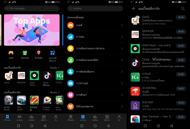 สำหรับ AppGallery ก็เป็นเหมือนกับ Play Store ของทาง Huawei ในนั้นมีแอปฯ มากมายครับ แต่ไม่ครบเท่ากับ Play Store รวมทั้งทาง Huawei ก่อนหน้านี้ก็ยังไม่ได้มาโฟกัสในจุดนี้ด้วย แต่จากนี้ไปรับรองว่าเราจะได้เห็นความเปลี่ยนแปลงครั้งใหญ่ครับ แค่ในช่วงที่ผ่านมาก็มีการอัดฉีดให้ผู้ใช้หันมาดาวน์โหลดแอปพลิเคชั่นใน AppGallery อย่างเข้มข้นเลยนะครับ ทั้งโปรโมชั่นแจกแต้ม และ Code เงินสด สำหรับตอนนี้ถ้าต้องการใช้งานแอปพลิเคชั่นที่เราคุ้นเคย ก็ต้องพึ่งแอปฯ ทดแทนต่างๆ ซึ่งมีข้อจำกัด และส่วนมากก็ไม่มีตัวเลือกให้ใช้