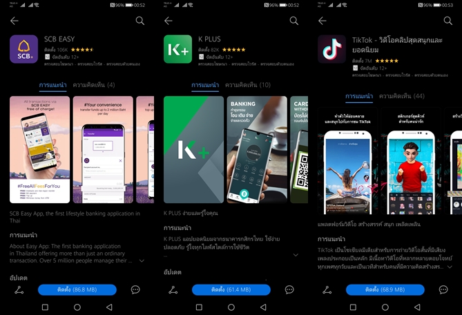 นอกจากว่า เราจะนำ GMS มาติดตั้งกันเอง ซึ่งก็สามารถทำได้ง่ายๆ แต่อย่างไรมันก็ไม่ปลอดภัยนะครับ หากตัดสินใจติดตั้งกันเองก็ต้องยอมแบกรับความเสี่ยงที่จะตามมาด้วย (สำหรับเครื่องที่นำมารีวิว ผมได้ติดตั้ง GMS เรียบร้อยแล้วครับ ถึงเสี่ยงแต่เพื่อรีวิวที่สมบูรณ์ก็ต้องยอม) ส่วนใครที่ติดตั้งไปแล้ว เกิดอยากจะเปลี่ยนใจใช้บริการ HMS เดิมๆ ที่มากับเครื่อง ก็สามารถแก้ไขได้ง่ายๆ เพียงแค่ Factory Reset ทุกอย่างก็จะกลับมาเหมือนเดิมครับ ส่วนตอนนี้ก็มีทยอยอัพเดท Security Patch ล่าสุดก็มีปล่อยให้ผู้ใช้แล้วเมื่อช่วงปีใหม่ที่ผ่านมา แถมตอนนี้มีผู้ให้บริการชั้นนำปล่อยแอปพลิเคชั่นของตัวเองลงใน AppGallery มากขึ้นแล้วด้วย อย่างล่าสุดมีแอปฯ จากธนาคาร Mobile Banking ให้ดาวน์โหลดกัน 3 รายแล้วไม่ว่าจะเป็น SCB EASY, K PLUS และ ME by TMB แสดงให้เห็นถึงความเอาจริงเอาจังของ หัวเว่ย อย่างชัดเจน