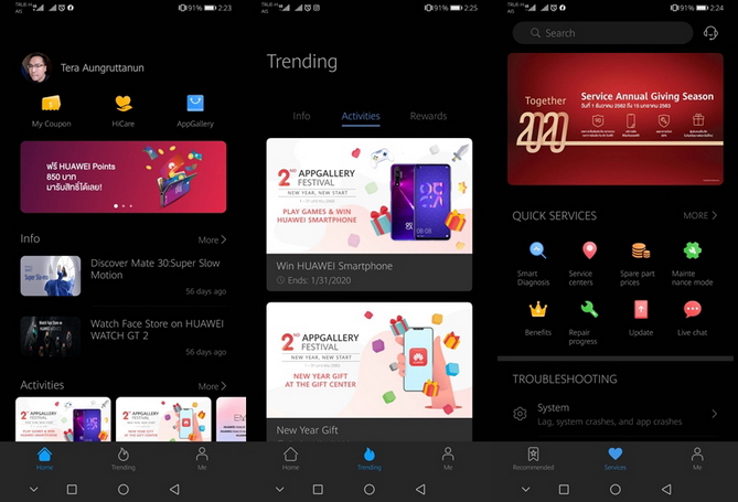 นอกจากนี้ Huawei ยังมี Member Center แอปฯ รวมสิทธิพิเศษต่างๆ สำหรับผู้ใช้สมาร์ทโฟนของ Huawei ซึ่งบอกเลยช่วงนี้แจกหนักต้อนรับปีใหม่มากๆ พร้อมมีข่าวสารอัปเดตใหม่ๆ มากมาย นอกจากนี้ยังลิงก์ไปสู่บริการ HiCare สำหรับเช็คข้อมูลการรับประกัน และราคาอะไหล่ รวมทั้งมีฟีเจอร์ตรวจสอบสมาร์ทโฟนเบื้องต้น เป็นแอปฯ ที่เวลาเราซื้อสมาร์ทโฟนของ Huawei สามารถตรวจเช็คก่อนซื้อเครื่องได้นะครับ และลิงก์ไปสู่ AppGallery