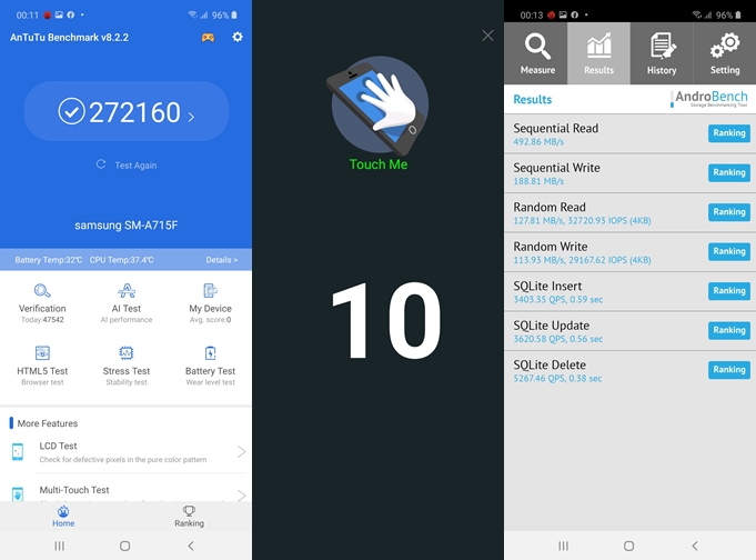 - ทดสอบด้วยแอปพลิเคชัน AndroBench ทำความเร็วในการอ่านอยู่ที่ 492.86 MB/s และการเขียน 188.81 MB/s (UFS 2.1 Storage)