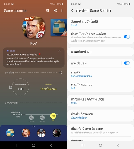 เรามาส่องจุดเด่นในเรื่องการเล่นเกมบน Samsung Galaxy A71 กันครับ รุ่นนี้มาพร้อม Game Launcher ฟีเจอร์รวมเกมทุกเกมบนสมาร์ทโฟนของเราเอาไว้ที่เดียว ปิดการแจ้งเตือนขณะเล่นเกม, ประหยัดพลังงานขณะเล่นเกม ทดสอบด้วยเกมยอดนิยมอย่าง ROV สามารถเล่นได้ที่ 59FPS - 60FPS สบายๆ เลย เล่นได้ราบลื่นไม่มีสะดุด และในส่วนของการทัชหน้าจอทำได้ราบลื่นดีมากครับ ใครที่ชอบเล่นเกม ในงบนี้ผมว่าเป็นตัวเลือกที่น่าสนใจมากๆ