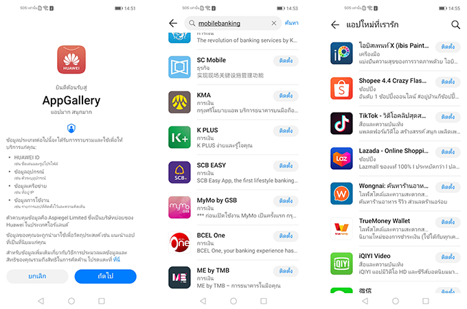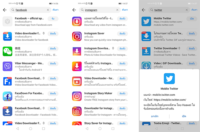 ในขณะที่ด้าน Social media แอปพลิเคชั่นที่คนไทยส่วนมากใช้งานกันไม่ว่าจะเป็น Facebook, Instagram หรือ Twitter ตามภาพด้านล่างก็จะเห็นว่ายังไม่มีและไม่สามารถใช้งานผ่าน AppGallery ได้นะครับ จะมีเพียงทวิตเตอร์ที่พอดาวน์โหลดลงบนเครื่องแล้ว ตัวแอปพลิเคชั่นก็จะเป็น Browser app แทน คือเด้งไปใช้งานผ่านเว็บบราวเซอร์แทนนั่นเอง รวมถึง Line ด้วยเช่นกันที่ยังไม่มีให้ใช้บริการ ดังนั้นใครที่สายโซเชี่ยลถ้าไม่ถนัดกับการหาพวกไฟล์ .APK มาลง แนะนำให้ลองใช้ Third party Store อย่าง Aptoide มาใช้งานแทนนะครับ (ซึ่งส่วนตัวผมยังไม่ได้ลองใช้งานเหมือนกันว่าเมื่อลงแอปฯ โซเชี่ยลแล้วจะใช้งานได้หรือไม่ เพราะตั้งใจรีวิวแบบ End user คนหนึ่งที่ไม่ต้องวุ่นวายใดๆ กับการใช้งาน)