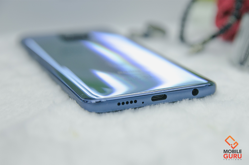 ด้านล่างตัวเครื่อง มีพอร์ต USB-C, ลำโพงเสียงตัวเครื่อง และรูเสียบหูฟังขนาด 3.5 มิลลิเมตร