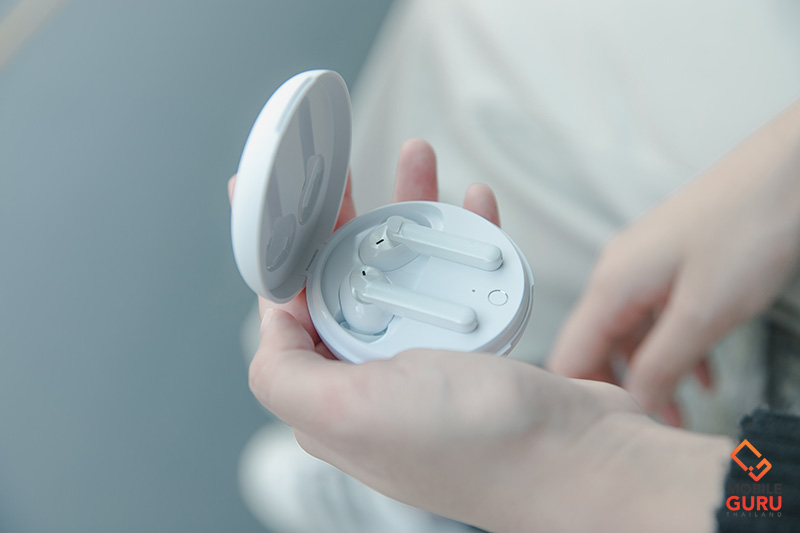 ตัวกล่องตลับของหูฟังเป็นรูปวงกลมทรงแบน ขนาดเล็ก กะทัดรัด ดีไซน์เป็นฝาพับคล้ายตลับแป้งพับ น่ารักมาก จุดนี้สาว ๆ ถูกใจแน่นอนค่ะ เมื่อเปิดฝาก็จะพบกับแป้นวางและชุดหูฟัง โดยบริเวณแป้นวางจะมีไฟแสดงสถานะการเชื่อมต่อและการชาร์จ ถัดลงมาจากไฟสถานะเล็กน้อยจะเป็นปุ่มกดสำหรับการ Pair Blutooth และเมื่อพลิกไปที่ตลับด้านหลังก็จะเป็นพอร์ตเชื่อมต่อแบบ USB-C สำหรับชาร์จ