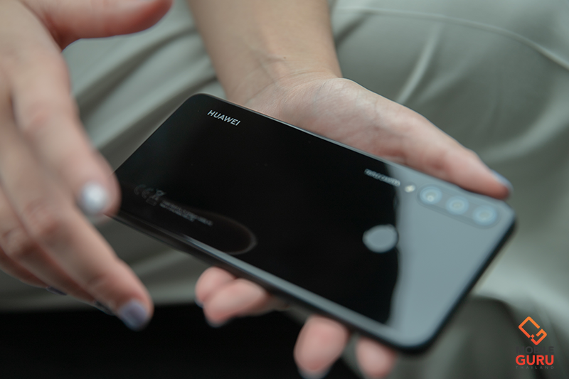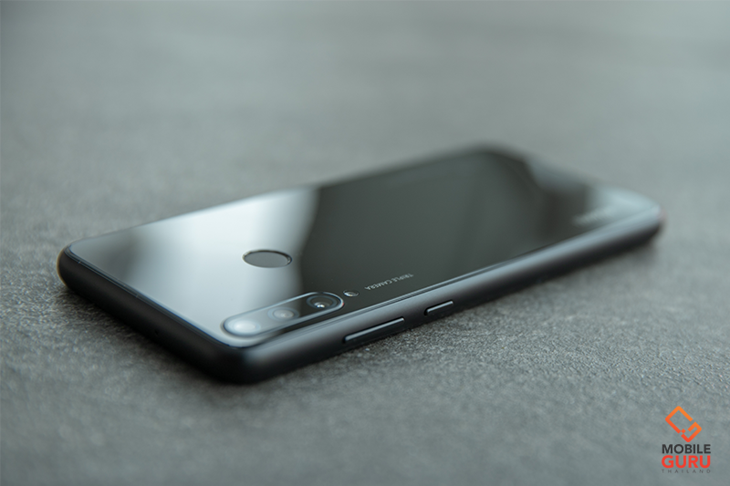 ด้านหลังตัวเครื่อง ใช้วัสดุเป็นกระจกทำให้พื้นผิวเปื้อนรอยนิ้วมือง่ายพอสมควรครับ แต่ก็ได้ความสวยหรูกลับมาเหมือนกัน ขยับไปที่บริเวณมุมซ้ายจะเป็นตำแหน่งติดตั้งกล้องถ่ายรูปของเครื่อง โดยครั้งนี้เลือกใส่กล้องแบบ Triple camera ความละเอียด 13 + 5 + 2 MP พร้อมไฟแฟลช LED ในตัวมาให้