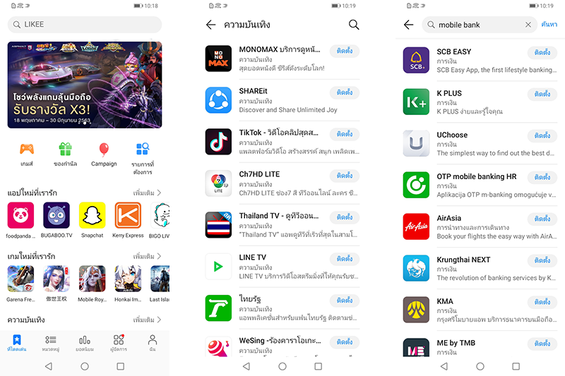 เช่น แอปพลิเคชั่นธนาคารตอนนี้ก็มากันเกือบครบแล้ว, Line แอปพลิเคชั่นแชทที่คนไทยใช้งานกันเป็นหลักก็เข้าสู่แพลตฟอร์มแล้วเช่นกัน (ฟีเจอร์ใช้งานยังตามเวอร์ชั่น Play Store อยู่พอสมควร) ส่วนแอปพลิเคชั่น Social Media หลัก ถ้าใครต้องใช้งานคงต้องเข้าใช้ผ่านเว็บบราวเซอร์บนตัวเครื่องแทนนะครับ ยังไม่ได้โดนปิดกั้นใช้ได้ตามปกติ ซึ่งภาพรวมถ้ามองเรื่องของแอปฯ สำหรับใช้งานหรือทำงานในแต่ละวันเทียบกับฝั่ง Play Store แล้ว ยังคงห่างกันอีกเยอะเลยล่ะครับ ถ้าใครไม่ได้ติดตรงนี้ก็ข้ามได้เลย