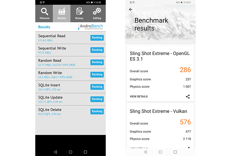 ทดสอบการประมวลผลกราฟฟิกด้วย 3D Benchmark Sling Shot Extreme ได้ผลคะแนน 286 (OpenGL) และ 576 (Vulkan) ทดสอบการเขียนและอ่านของหน่วยความจำภายใน ได้ Sequential Read 276.61 MB/s และ Sequential Write 97.51 MB/s กล้องถ่ายรูป Triple Camera