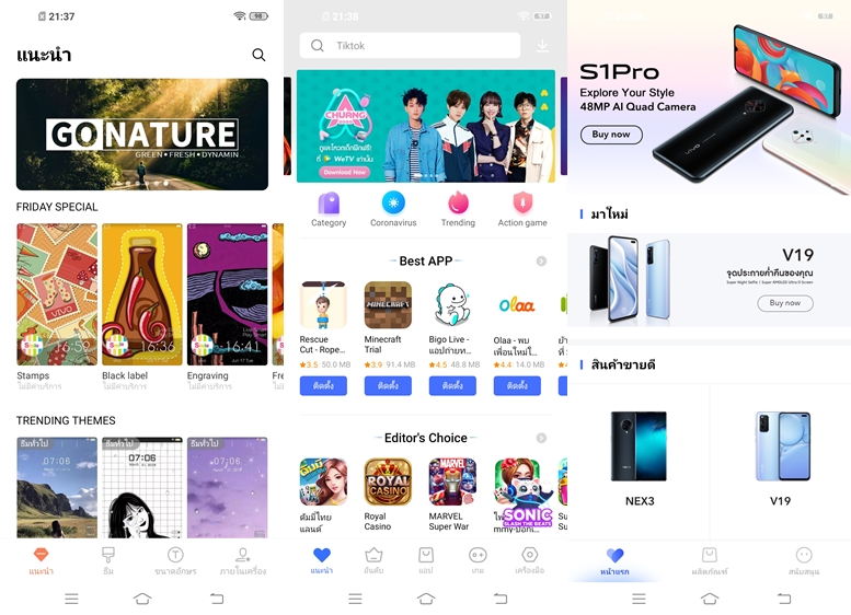นอกจากนี้ Vivo ยังใส่ V-Appstore แหล่งรวมดาวน์โหลดแอปพลิเคชั่นของตัวเองมาให้ด้วย เผื่อว่าแอปฯ ไหนหาไม่ได้ใน Play Store ก็สามารถมาดาวน์โหลดในแอปฯ นี้ได้เลย รวมทั้งมี Vivo Theme มาให้ดาวน์โหลดกันด้วย ในนั้นมีทั้งธีม, Wallpaper, Lockscreen, แบบอักษร ให้เลือกดาวน์โหลดอย่างจุใจ มีทั้งฟรี และเสียเงินครับ นอกจากนี้ในส่วนของ Vivo.com จะเป็นแอปฯ แสดงสินค้า และราคา รวมทั้งบริการหลังการขาย เราสามารถลงทะเบียนรับประกันได้ในนี้เลย รวมทั้งเช็คศูนย์บริการ เช็คราคาอะไหล่ และติดต่อเจ้าหน้าที่ได้ครับ สะดวกมากๆ