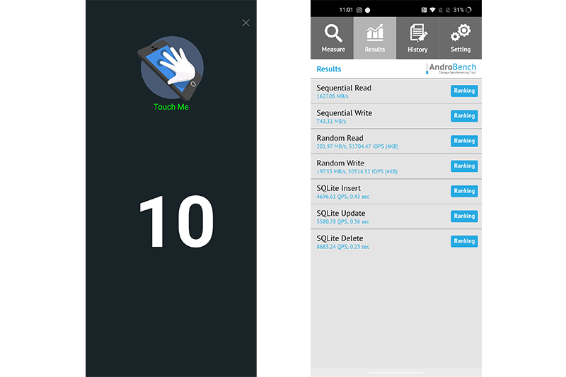 - ทดสอบการอ่าน-เขียนของหน่วยความจำด้วย AndroBench ได้ผลการอ่าน 1627.03 MB/s | การเขียน 743.31 MB/s
