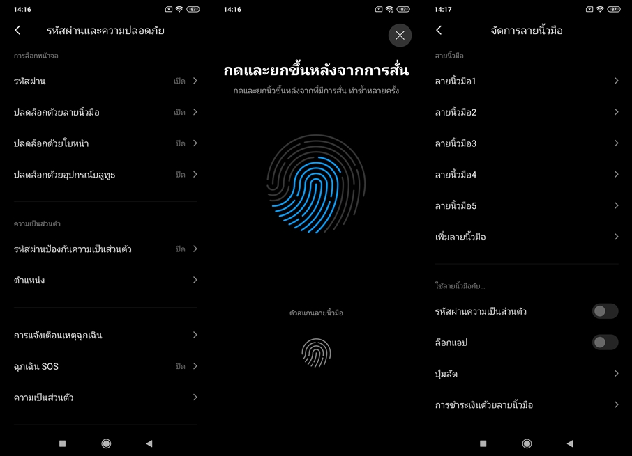 Mi Note 10 Lite รองรับทั้ง Face ID และ Fingerprint (under display, optical) รองรับสูงสุด 5 ลายนิ้วมือ ความรวดเร็ว และความแม่นยำทำได้ดีมากๆ สามารถตั้งภาพการสแกนได้ 4 รูปแบบ สวยๆทั้งนั้น