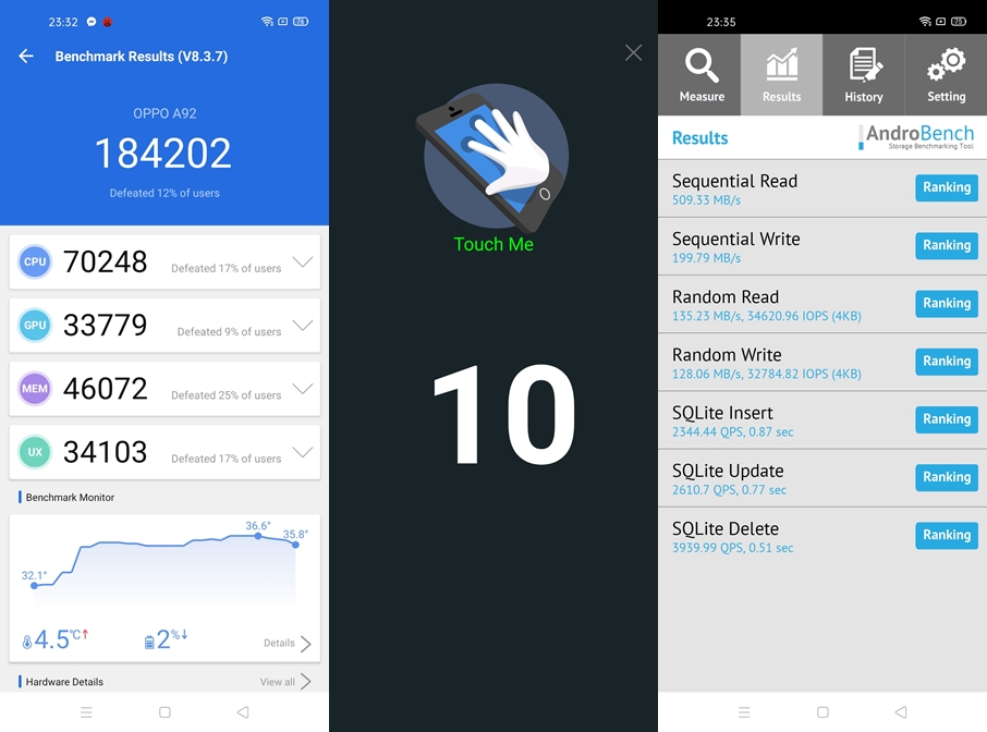 OPPO A92 มาพร้อมหน้าจอ Punch-hole Display (1080P Neo-Display) ขนาดใหญ่ถึง 6.5 นิ้ว ความละเอียด Full HD+ เป็นหน้าจอที่สวยมากครับ แถมยังมีความสว่างสูง ใช้งานกลางแจ้งได้สบายๆ มาพร้อมฟีเจอร์ Game Space และเทคโนโลยี Hyper Boost ช่วยให้การเล่นเกมทำได้ดีมากๆ ผมทดสอบด้วยเกมอย่าง ROV ค่าเฟรมเรทอยู่ที่ 59FPS - 60FPS และเกม PUBG สามารถปรับภาพในระดับสมดุล และค่าเฟรมเรทระดับกลาง การทัชหน้าจอลื่นติดนิ้วดีครับ ไม่มีอาการหน่วง หรือทัชไม่ไปเลย สำหรับคนที่ชอบเล่นเกม ผมว่ารุ่นนี้ผ่านครับ และสำหรับการรับชมคลิปวีดีโอ รุ่นนี้ทำได้ดีเลยนะครับ หน้าจอกว้าง ขอบจอบาง รับชมได้อย่างเต็มตา กล้องหน้าอยู่ในตำแหน่งที่ไม่บดบังสายตาด้วย และมาพร้อมลำโพงคู่ รองรับระบบเสียง DIRAC ทั้งเล่นเกม และรับชมคลิปวีดีโอ สนุก และเข้าถึงอารมณ์มากกว่าที่เคย