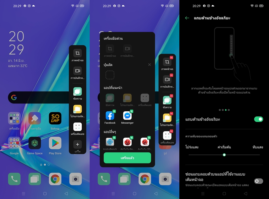 OPPO มีมาให้ครบทั้ง App Market, Game Center และ Theme Store มีทั้งฟรี และเสียค่าใช้จ่ายครับ ใครที่หาแอปพลิเชั่นที่ไม่มีใน Play Store ก็สามารถเข้าไปดาวน์โหลดกันได้ผ่านบริการของออปโป้ได้เลย และทาง OPPO ก็ยังมีฟีเจอร์ที่น่าสนใจอย่าง Game Space และเทคโนโลยี Hyper Boost เป็นฟีเจอร์เพิ่มประสิทธิภาพในการเล่นเกม จัดสรรพลังงาน, ปรับแต่งประสิทธิภาพ, จัดการการโทร, ข้อความ และการแจ้งเตือนระหว่างการเล่นเกม เพื่อประสบการณ์การเล่นเกมที่ดีที่สุดบนสมาร์ทโฟนของออปโป้ และมาพร้อมแอปพลิเคชั่น Soloop สามารถตัดต่อ และปรับแต่งวีดีโอ ผ่านเทมเพลตสุดเท่ ที่มีความหลากหลาย สามารถสร้างงานวีดีโอแบบสำเร็จรูปได้อย่างง่ายดาย และ OPPO Relax แอปฯ แสดงภาพและเสียงเพลง รวมไปถึงเสียงรบกวน ที่ทำให้เรารู้สึกผ่อนคลาย ช่วยให้เรานอนหลับง่ายยิ่งขึ้น หรือเปิดใช้งานตอนเราออกกำลังการอย่างการเล่นโยคะ หรือตอนทำสมาธิ ผมว่ามันใช้งานได้ผลมากๆ เพราะผมก็มีอาการนอนหลับยากเหมือนกัน