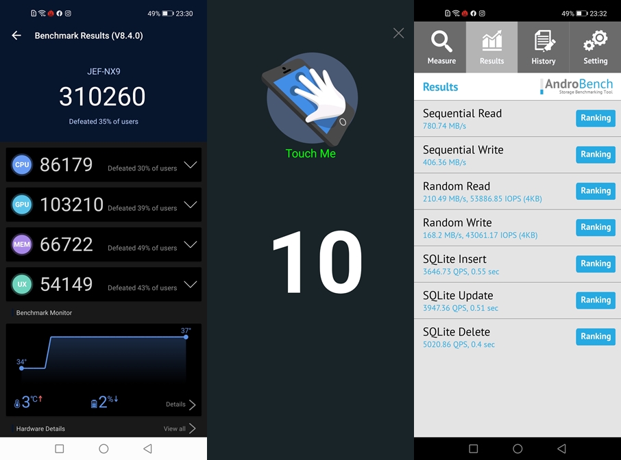 - ทดสอบด้วยแอปพลิเคชัน AndroBench ทำความเร็ว Storage ในการอ่านอยู่ที่ 780.74 MB/s และการเขียน 406.36 MB/s