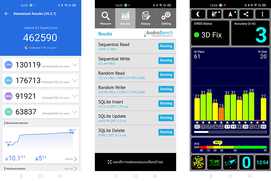 สำหรับทางด้านของประสิทธิภาพการใช้งานทั่วๆ เช่น การโทรเข้า-รับสาย, เล่นโซเชียล, การรับชมคอนเท้น รวมไปถึงการใช้แอปพลิเคชั่นต่างๆ ตัวเครื่อง realme X3 SuperZoom สามารถตอบสนองการใช้งานได้ดีมาก ลื่นไหล ไม่มีอาการค้าง หน่วง หรือ Error ให้เห็นตลอดการใช้งานทดสอบในครั้งนี้ครับ ด้วยการขับเคลื่อนการทำงานด้วยชิปประมวลผล Snapdragon 855+ ทำงานร่วมกับหน่วยความจำ UFS 3.0 และ RAM 12GB ตอบโจทย์การประมวลผลระดับสูง ดังนั้นการใช้งานในระดับพื้นฐานทั้งหมดสอบผ่านแน่นอนครับ