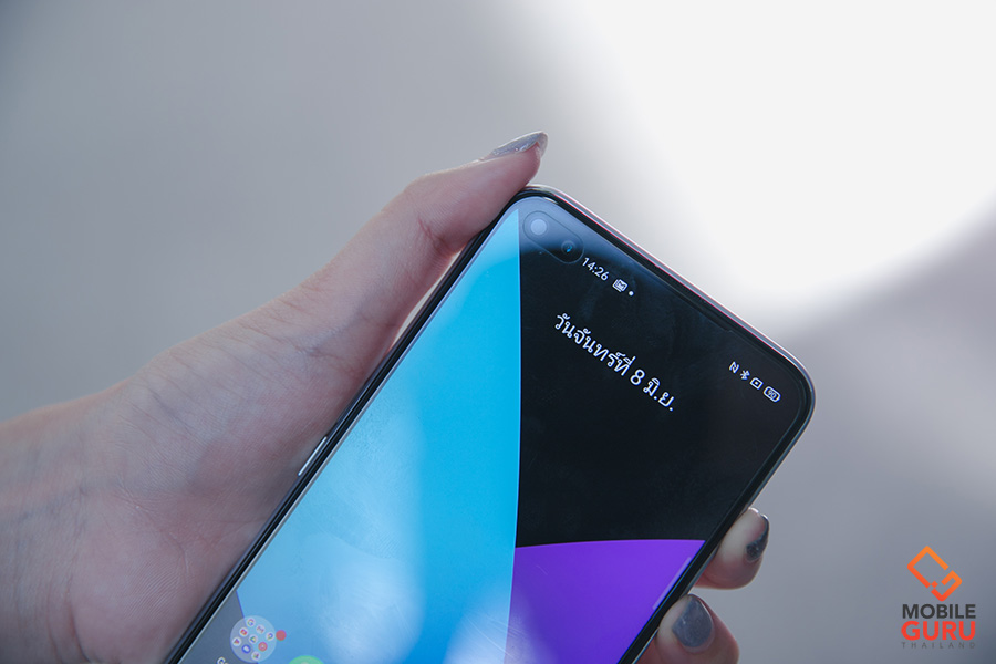 ขยับขึ้นไปบริเวณมุมซ้ายบนของหน้าจอ เป็นตำแหน่งของกล้องหน้าคู่ที่ครั้งเป็นกล้องแบบซ่อนใต้หน้าจอ ซึ่งทางเรียลมีใช้ชื่อว่า Dual In-Display Selfie ความละเอียด 32MP + 8MP (กล้องหลัก F2.5 + กล้องมุมกว้าง F2.2)
