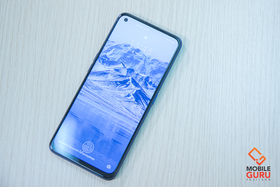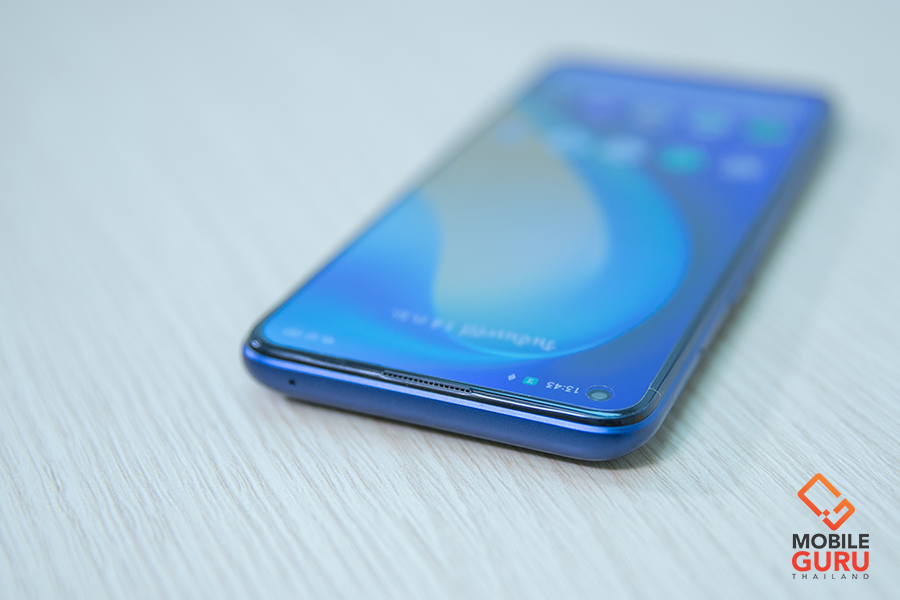 ขยับขึ้นไปมุมซ้ายบนของหน้าจอ จะพบกับกล้องหน้าแบบฝังใต้หน้าจอ (In-display selfie) 1 ตัว ความละเอียด 32MP (F2.5) มีค่า FOV 85 องศา พร้อมฟีเจอร์ถ่ายรูปเด่นๆ Time-lapse Photography, HDR, Front Panorama, Beauty, Flip Selfie, Nightscape, Portrait Mode