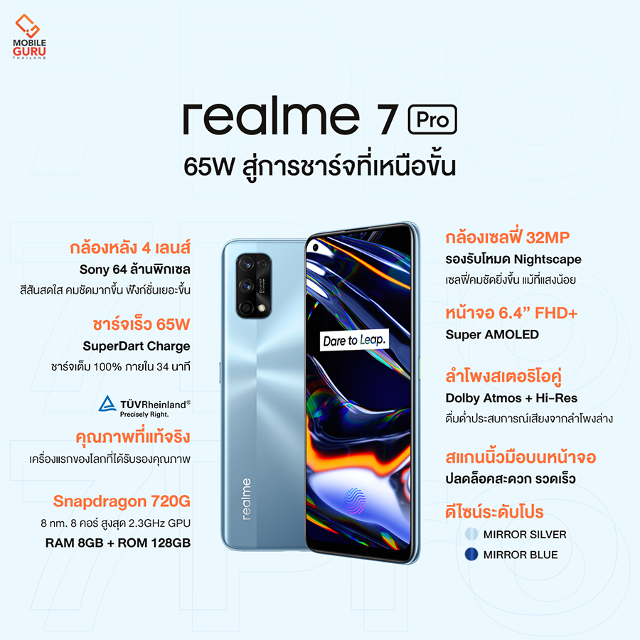 realme 7 Pro เป็นอีกหนึ่งมือถือตัวจบของตลาด Entry-mid เลยก็ว่าได้ ซึ่งครั้งนี้มาพร้อมจุดเด่น 8 ด้าน ที่ทางเรียลมีใส่มาให้แบบคุ้มค่าและคุ้มราคาเหมือนรุ่นก่อน ไม่ว่าจะเป็นจุดขายหลักของรุ่นนี้กับเทคโนโลยีชาร์จไว SuperDart Charge 65W ที่ปกติไม่น่าจะมาอยู่ในมือถือราคาเรทนี้ได้เลย หรือจะเป็นหน้าจอแสดงผล AMOLED มาตรฐาน TUV Rheinland รุ่นแรก รวมไปถึงด้านเสียงที่ให้ลำโพงเสียงสเตอริโอพร้อมระบบ Hi-Fi และ Dolby Atmos มาให้ในตัว และดีไซน์ตัวเครื่องที่ทำออกมาดูดีสมราคา ซึ่งทั้งหมดที่กล่าวมารวมเข้าไว้บน realme 7 Pro รุ่นนี้ทั้งหมดเลย ทำให้กลายเป็นสมาร์ทโฟนในพิกัดราคานี้ที่น่าสนใจอีกรุ่นในช่วงไตรมาสสุดท้ายของปีนี้เลยล่ะครับ