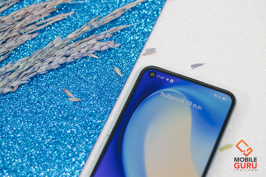 ด้านหน้าตัวเครื่อง มีหน้าจอแสดงผล Ultra smooth Display ขนาด 6.5 นิ้ว ความละเอียดระดับ HD+ ให้ค่า refresh rate ที่ 90Hz ส่วนด้านบนมุมซ้ายของหน้าจอติดตั้งกล้องหน้าแบบ In-display ความละเอียด 8MP มาให้ พร้อมกับไฟแสดงสถานะใช้งานสีขาวเมื่อมีการเรียกใช้งานกล้องหน้ารอบตัวเลนส์กล้อง
