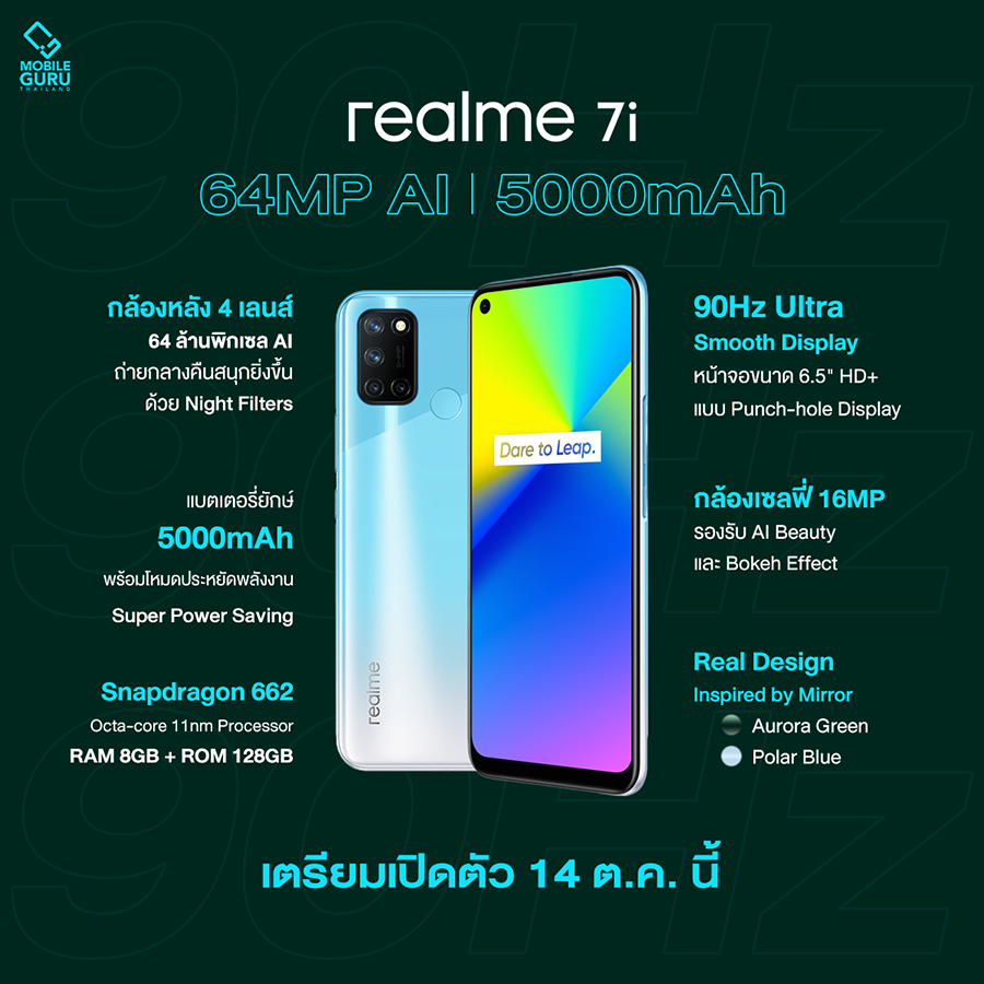 realme 7i ในวันที่ 14 ตุลาคม 2563 นี้ โดยจะมาพร้อมสีตัวเครื่องทั้งหมด 2 สี คือ สีฟ้า Polar Blue และสีเขียว Aurora Green ส่วนรายละเอียดและโปรโมชั่นการวางจำหน่ายรอติดตามชมกันอีกครั้งในงานเปิดตัวจาก realme ครับ